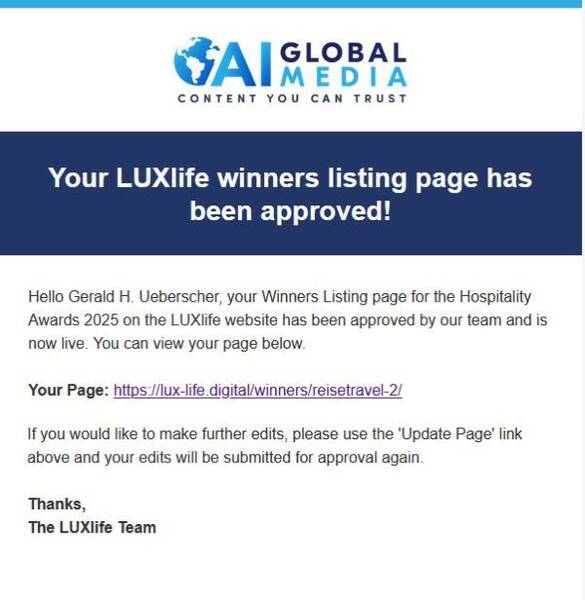 Die Redaktion ReiseTravel bedankt sich für das Vertrauen, das freundliche Lob und die errungene Auszeichnung:
