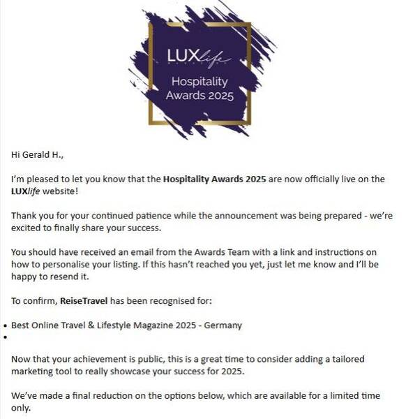 With this in mind, I am delighted to get in touch with you today and inform you that Reisetravel has been awarded: